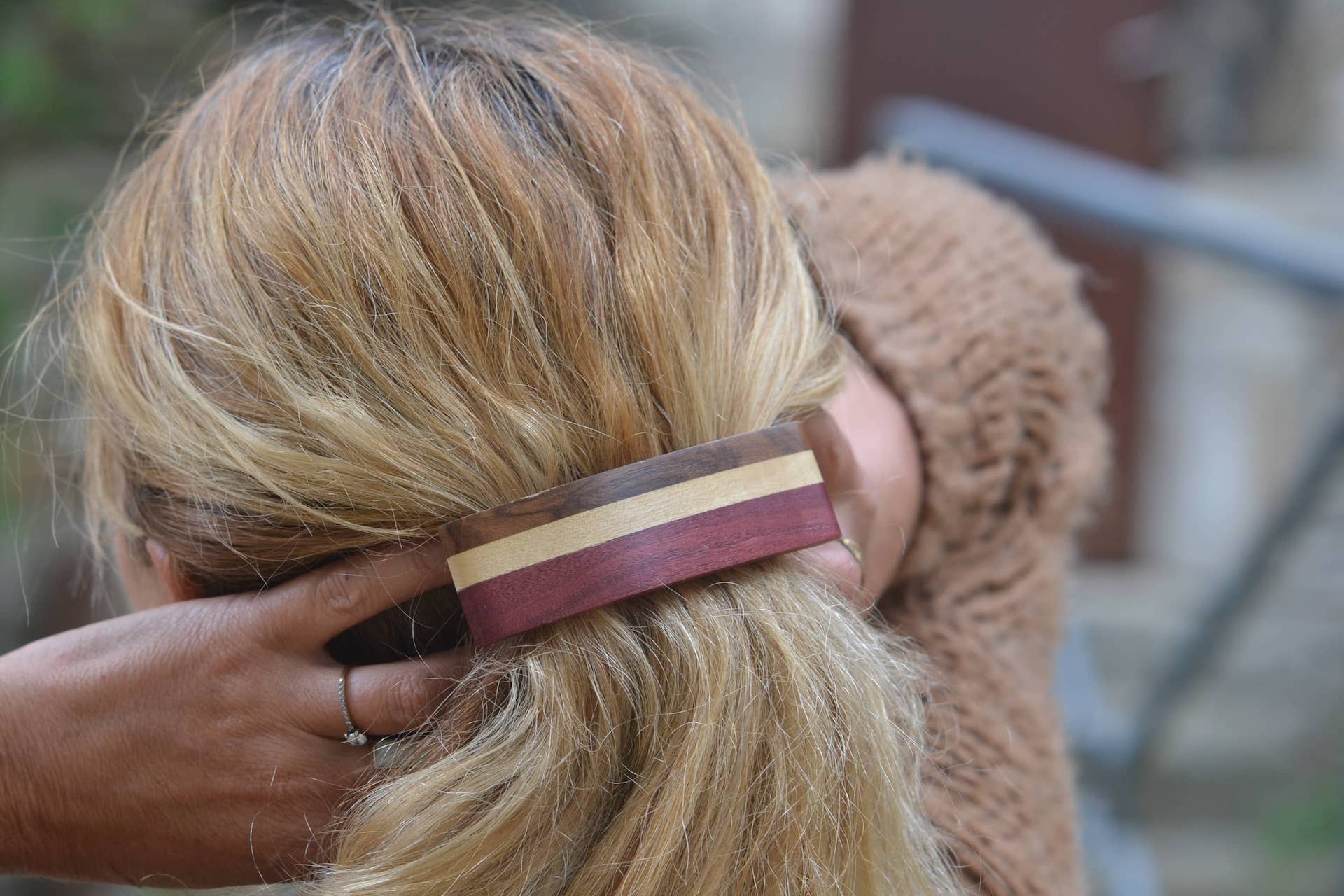 Notre collection de barrettes en bois pour femmes met à l'honneur une technique artisanale d'exception : la marqueterie. Cet art délicat consiste à assembler de fines pièces de bois de différentes essences pour créer des motifs décoratifs complexes et colorés. Chaque barrette devient ainsi une mosaïque unique, un tableau miniature qui joue avec les couleurs et les textures naturelles du bois. Ces barrettes en bois faites main sont le fruit d'un travail de patience et de précision, où chaque détail est pensé pour créer une harmonie visuelle. Elles sont parfaites pour celles qui recherchent un accessoire qui sort de l'ordinaire et qui raconte une histoire.