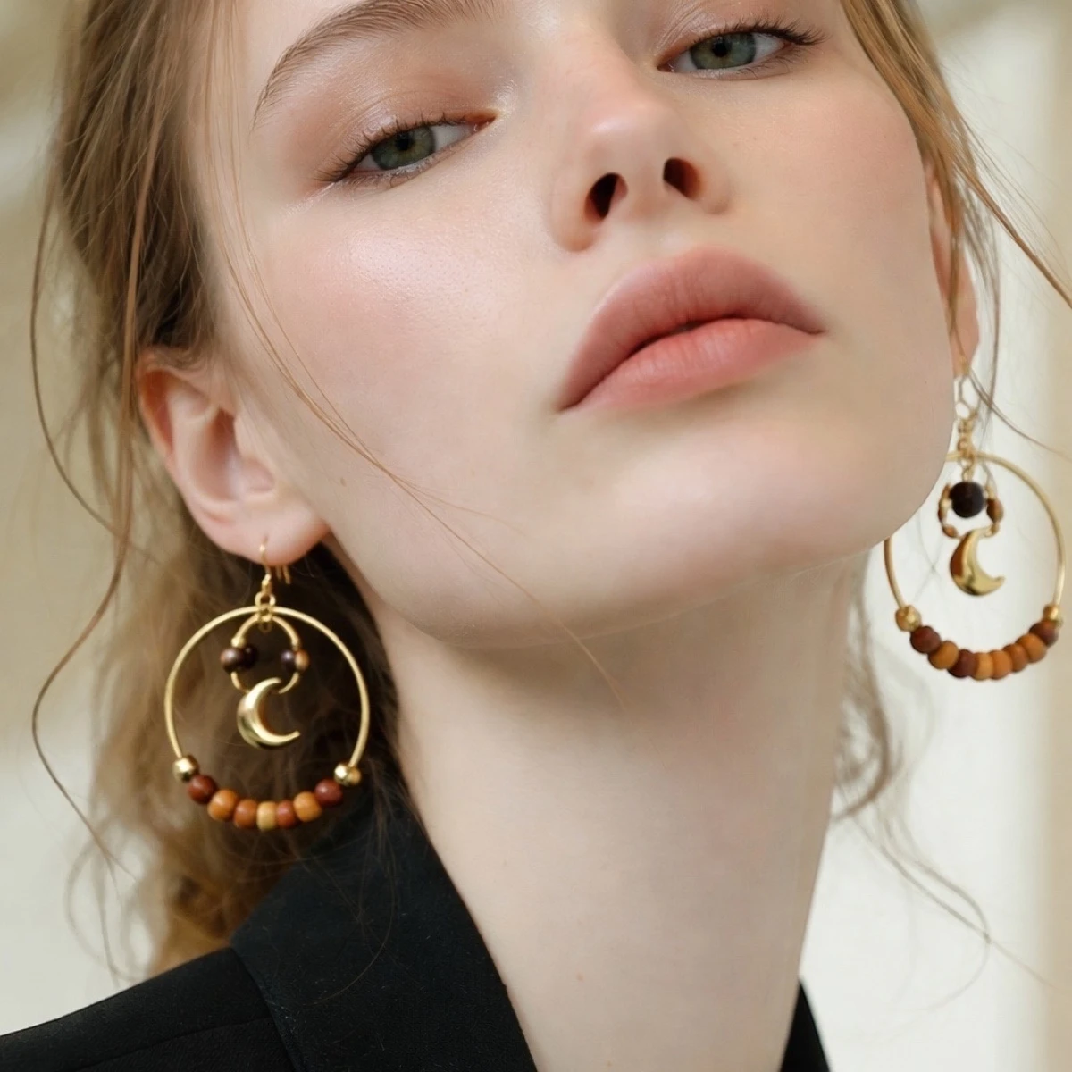 Boucle d’oreille dorée avec lune et ses perles en bois