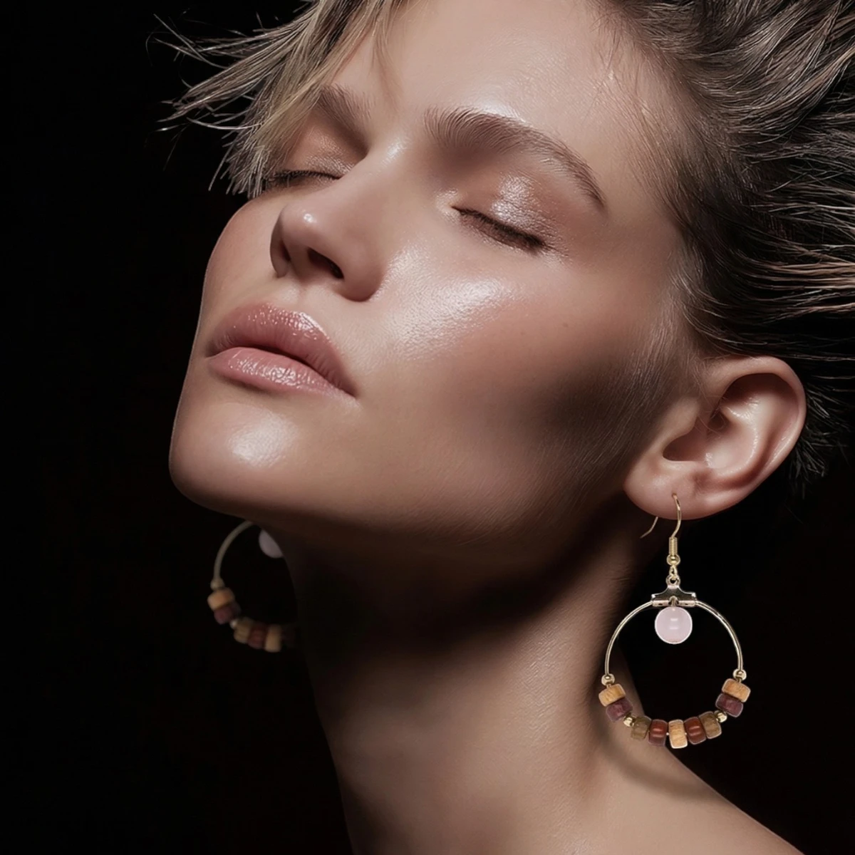 Le rose de la pierre associé aux essences de bois donne une allure élégante et discrète à cette boucle d’oreille kenia by Essenciel.