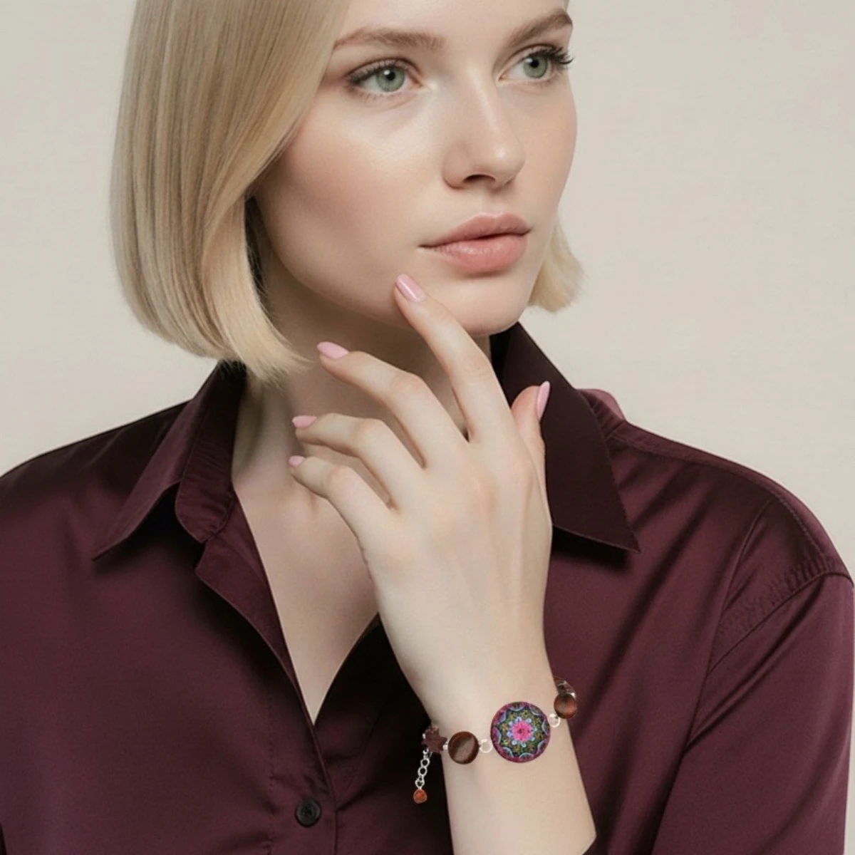 - Ce bracelet en bois est composé d’un rond cabochon de 20mm motif mandala, accompagné de perles en bois rondes et d’étoiles.