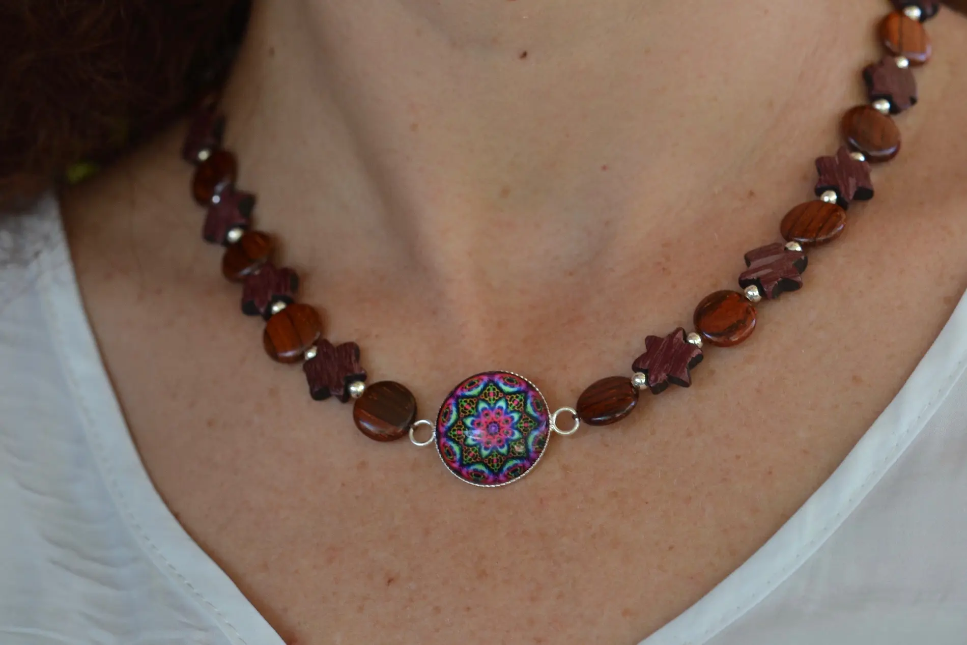 - Ce collier naturel en bois est composé de différente perles en bois d’amarante et d’acajou en forme d’étoiles et rondes, accompagné d’un cabochon de 20mm en verre dans les tons multicolore.