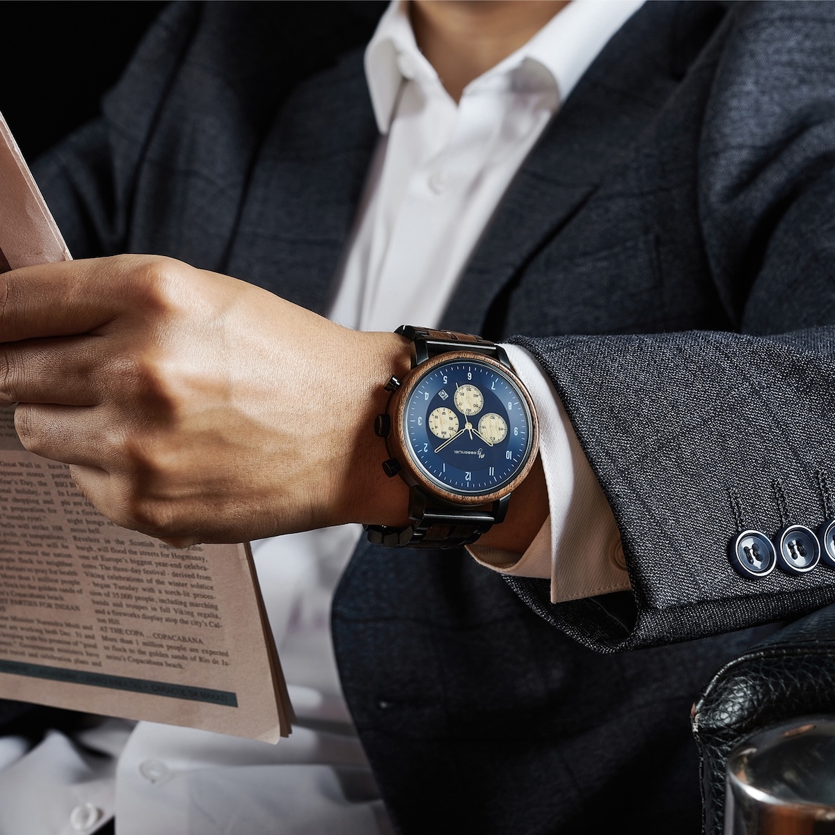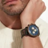 Son cadran en bois de noyer est sublimé par un fond bleu métallisé évoquant les reflets de l’océan. Trois sous-cadrans beige métallisé, intégrés avec finesse, offrent les fonctions chronographe. Les chiffres index et arabes assurent une lecture fluide. Le verre en cristal vient protéger l’ensemble avec brillance et résistance.
