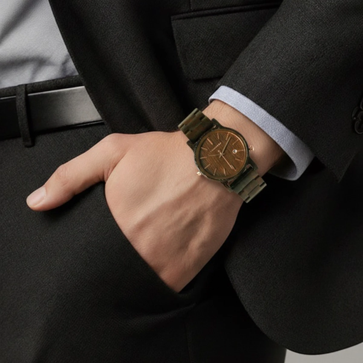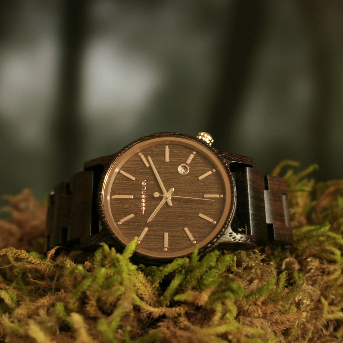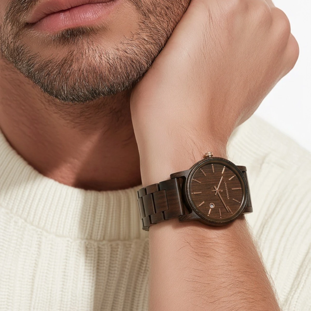 Le bracelet en bois d’ébène de la montre assure un confort optimal tout en étant résistant. Grâce à deux fines plaques métalliques aux extrémités, le bracelet se renforce, garantissant une longue durée de vie. De plus, la montre inclut deux maillons supplémentaires pour un ajustement parfait à votre poignet. Pour varier les styles, vous pouvez adapter le bracelet avec des bracelets en cuir.