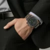 Le cadran métallisé noir, structuré et moderne, accueille trois mini-compteurs verts métallisés qui ajoutent une note audacieuse. Les index minimalistes assurent une lisibilité parfaite, tandis que le dateur intégré complète la fonctionnalité. Le tout est protégé par un verre en cristal, durable et résistant aux rayures.